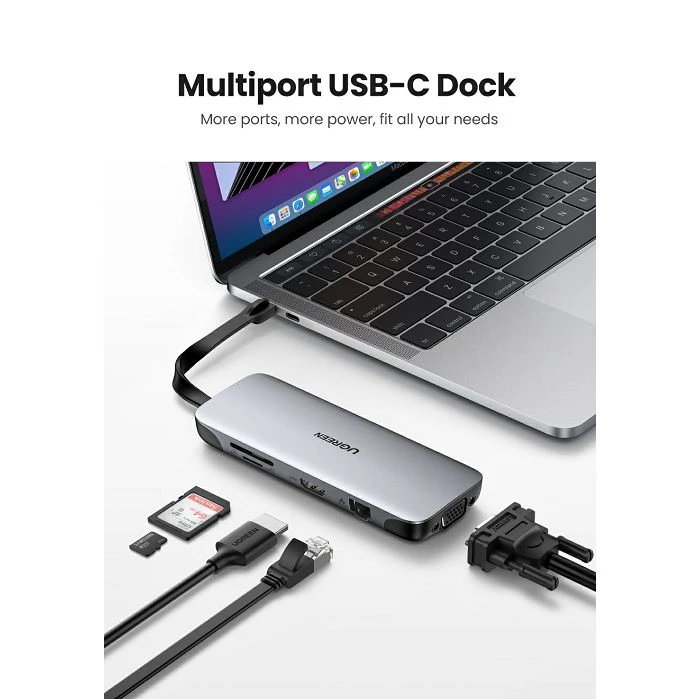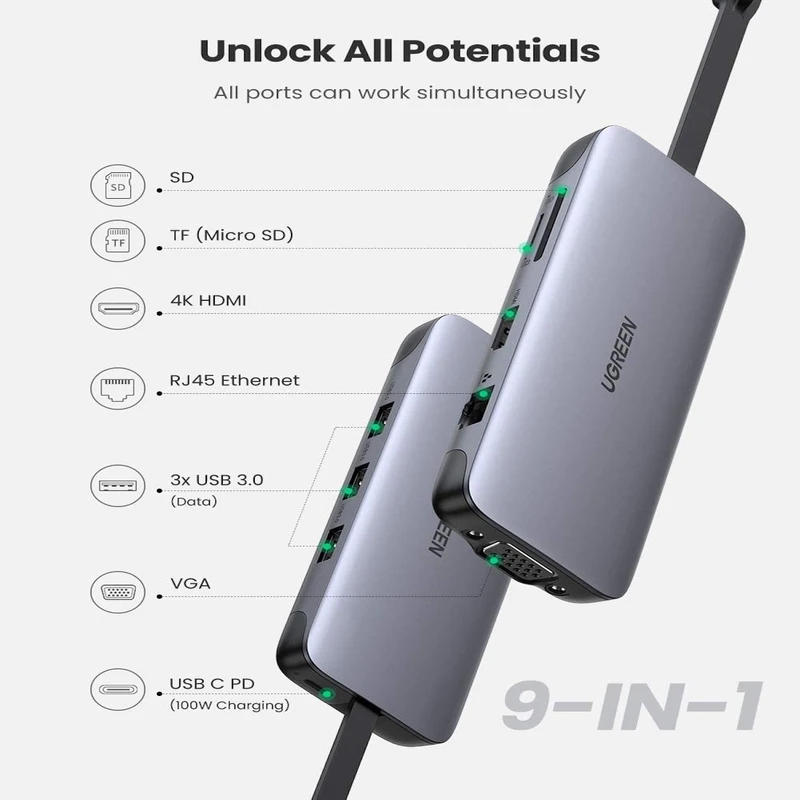 هاب Ugreen 9in1 با طراحی منحصر به فرد و عملکرد فوقالعاده، پاسخی شگفتانگیز به نیازهای شما است. این محصول نه تنها برای لپتاپها، بلکه برای اسمارتفونها و تبلتها نیز طراحی شده است با قابلیت اتصال انواع فلشدرایوها، درایوهای خارجی و دیگر وسایل جانبی، هاب Ugreen 9in1 تعداد درگاهها را با اضافه کردن 9 پورت جدید (3x USB, USB Type C PD، HDMI، VGA، اترنت RJ45، خواننده کارت SD و میکرو SD) به طور چشمگیری افزایش میدهد. تجربهای بینظیر از سرعت با USB 3.2 Gen 1؛ با دو درگاه USB 3.2 Gen 1، انتقال دادهها با سرعت شگفتانگیز 5 گیگابیت بر ثانیه را تجربه کنید، که بیش از 10 برابر سریعتر از نسل قبلی است. شارژ سریع با قدرت USB Type C Power Delivery 100W؛ این قابلیت به شما امکان میدهد تا بدون از دست دادن راحتی استفاده از دستگاه، قدرت آن را به سرعت بازیابی کنید. وقتی صفحهنمایش کوچک است، پورتهای HDMI و VGA به شما امکان میدهند یک پروژکتور یا تلویزیون را به کامپیوتر خود متصل کنید و تجربهای سینمایی را در خانه به ارمغان بیاورید.
