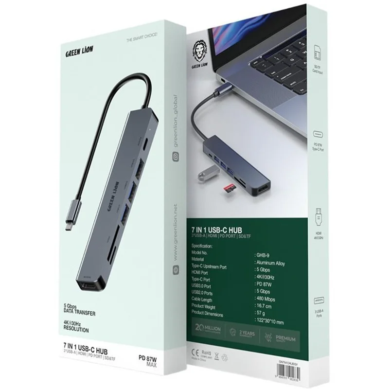 هاب 7 پورت گرین لاین مدل GHB-9 با پارت نامبر GN7N1CHUBGY یک راهحل مهندسیشده برای حرفهای هایست که در دنیای مدرن لپتاپهای باریک فاقد درگاههای کافی دارند. ویژگی برجسته این هاب، بهرهگیری از پورت Type-C با فناوری PD 87W است که به شما اجازه میدهد لپتاپ خود را با سرعت بالا شارژ کنید و همزمان از ۶ پورت دیگر بدون افت ولتاژ استفاده نمایید. بدنه این محصول از آلیاژ آلومینیوم ساخته شده است که علاوه بر مقاومت بالا در برابر ضربه، به عنوان یک سیستم خنککننده عمل کرده و از داغ شدن دستگاه در زمان انتقال اطلاعات سنگین جلوگیری میکند. کابل ۱۶.۷ سانتیمتری آن نیز طول استانداردی را فراهم میکند تا هاب به راحتی روی میز قرار گیرد و فشاری به درگاه لپتاپ وارد نشود.