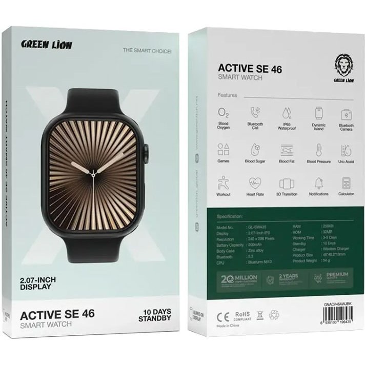 ساعت هوشمند اکتیو اس ای گرین لاین مدل Green Lion Active SE 46ترکیبی عالی از فناوری نوآورانه و طراحی زیبا. صفحه نمایش 1.96 اینچی IPS 240×296 آن تصاویری واضح و واضح ارائه میدهد و تجربه شما را چه در حال ردیابی معیارهای سلامتی، خواندن اعلان ها، یا صرفاً اعلام زمان باشید، بهبود می بخشد. صفحه نمایش مربع کامل رنگی از پیچیدگی مدرن را به شما اضافه می کند که مناسب هر لباسی است. اما این ساعت هوشمند چیزی فراتر از یک چهره زیبا است. دارای زمان آماده به کار فوق العاده 15 روزه است که به عنوان یک همراه ثابت و قابل اعتماد برای نظارت بر فعالیت های شما و در ارتباط ماندن عمل می کند. شارژر مغناطیسی راهی سریع و ایمن برای شارژ مجدد دستگاه شما ارائه می دهد. آسانی را تجربه کنید. برقراری تماسهای بلوتوثی مستقیماً از مچ دست و استفاده از سهولت چندین عملکرد NFC برای تراکنشهای سریع. ساعت هوشمند Green Lion که برای مقاومت در برابر سبک زندگی فعال ساخته شده است با مقاومت آب IP67 عرضه میشود. با ساعت هوشمند شیر سبز، میتوانید سبک زندگی فعال و متصل را در پیش بگیرید.
